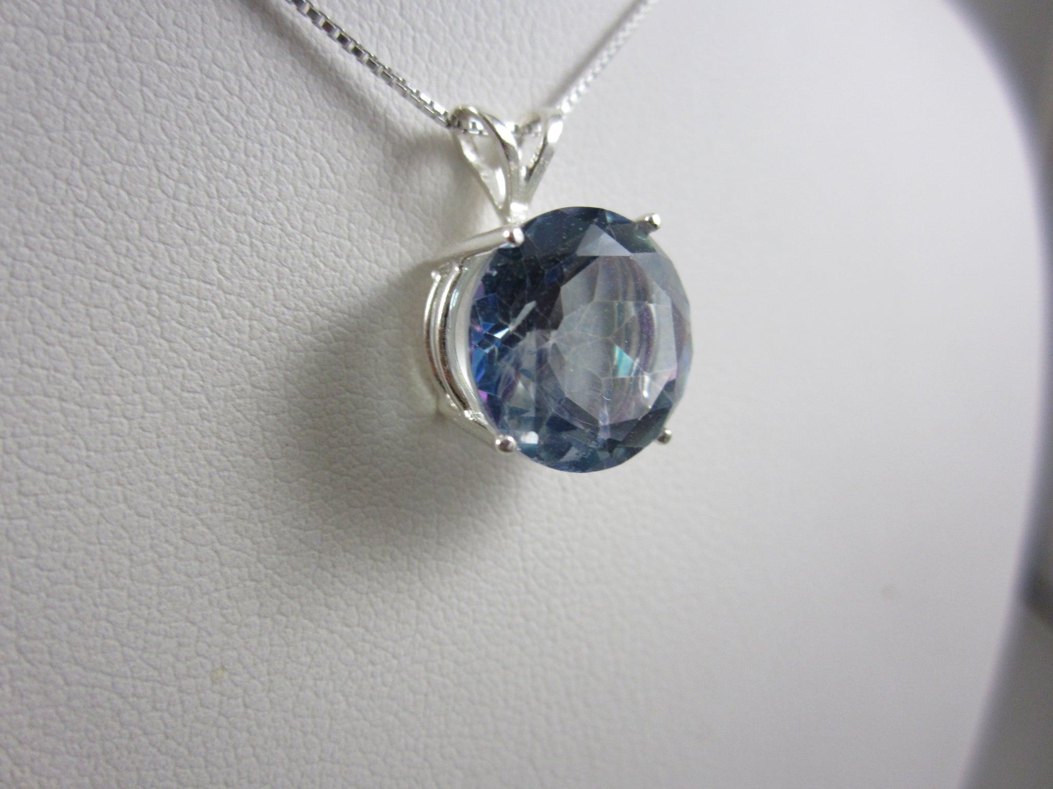 This pendant is made with a Mystic Topaz gemstone set in sterling silver. The gemstone is a 12mm round and is 7.50 CTW. The pendant comes with an 18” sterling silver box chain.